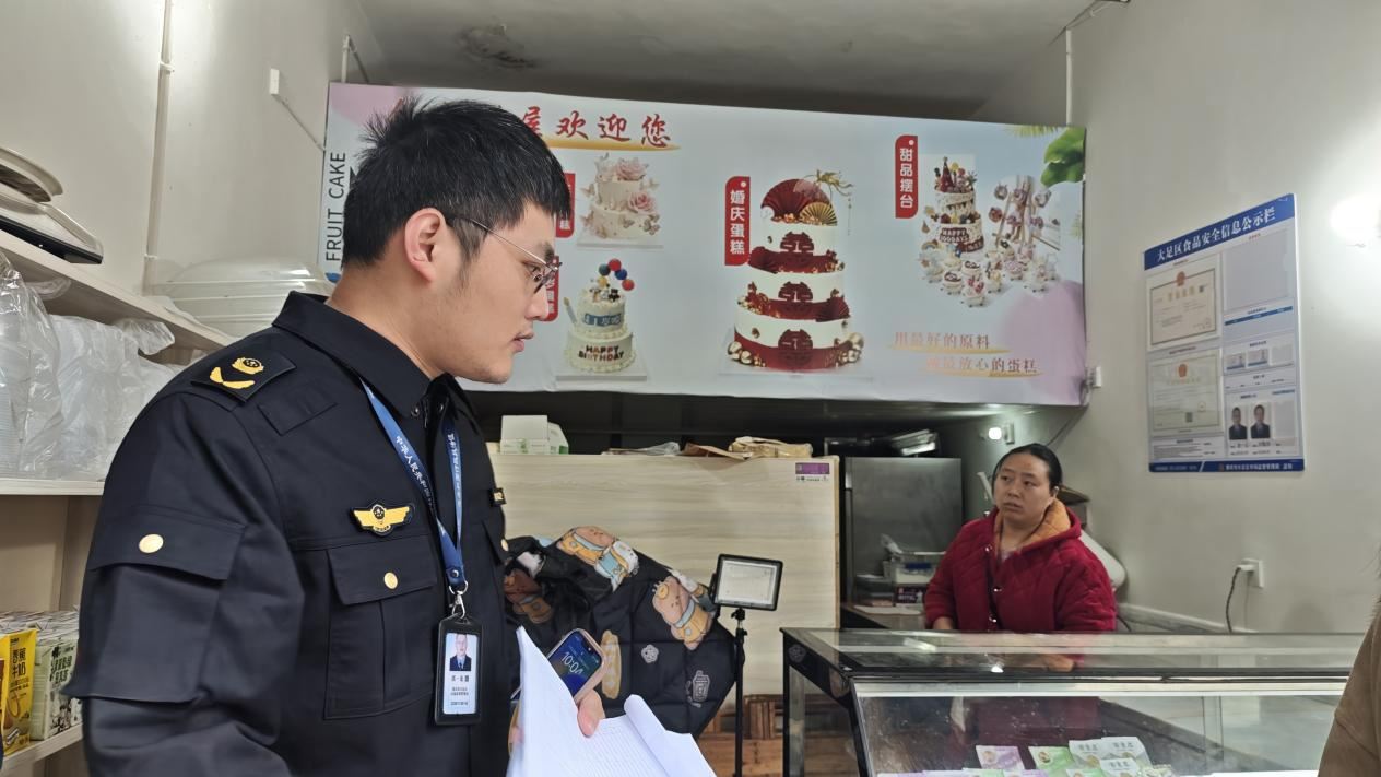 24546 次浏览 11-11近日,大足区龙水镇市场监管所开展蛋糕店专项检查,旨在全面排查食品风险隐患。工作中,执法人员坚持问题导向,采取多项有力措施,确保检查不走过场、取得实效。 执法人员重点检查了各店铺的食品原料进货查验记录、